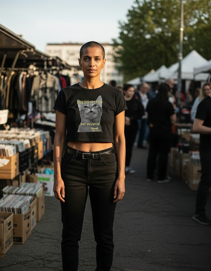 Das Ladies Cropped Tee mit frechem Naughty Cat Print verkörpert den einzigartigen Berlin-Vibe aus Minimalismus, Techno und Kink. Setze ein klares Statement für deine Selbstbestimmung.