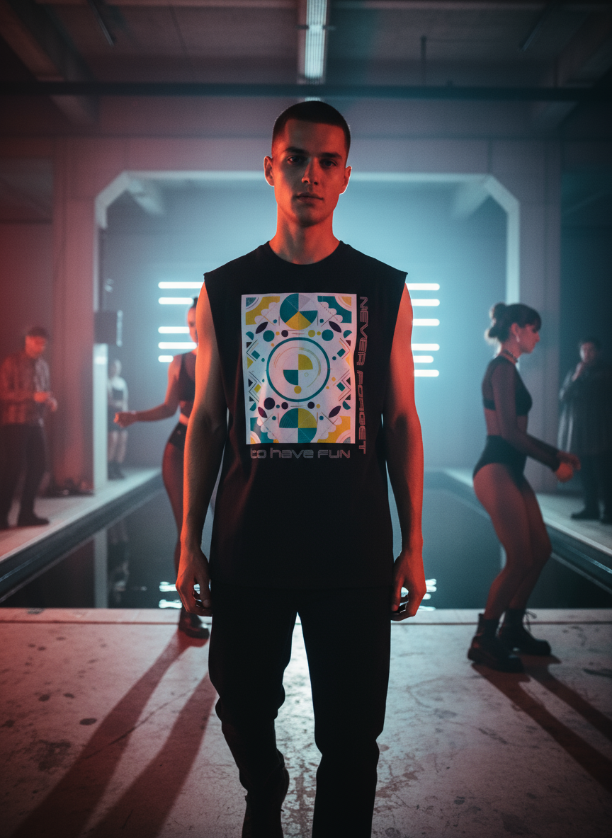 Setze ein klares Statement mit unserem Sleeveless Oversize Shirt. Der einzigartige Geometric Print fängt den Geist von Techno und Kink ein, perfekt für deine Urban-Vibes in Berlin und darüber hinaus.